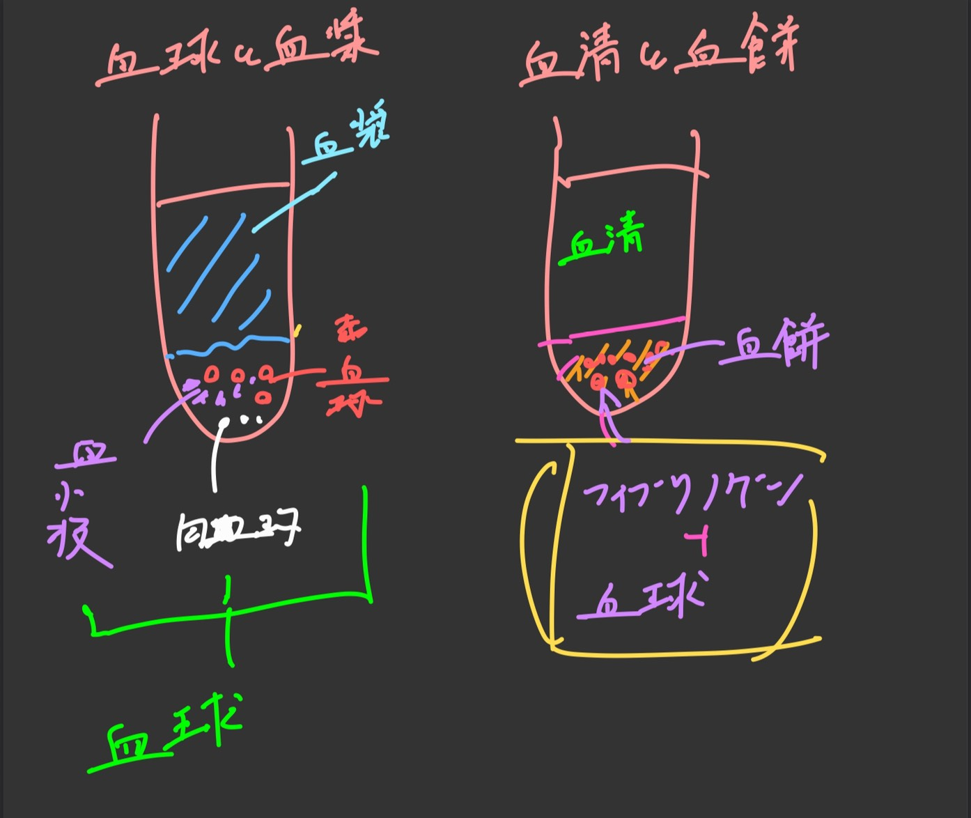血清と血餅に分けられます。血餅は(フィブリノゲンと血球からなります)。