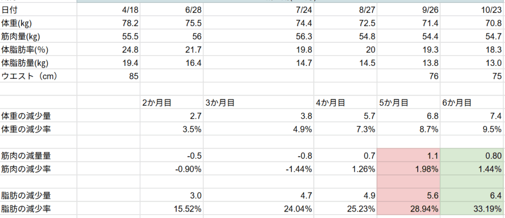 先月の結果から、開始時よりも体重の減少はありましたが筋肉量の減少もありました。
