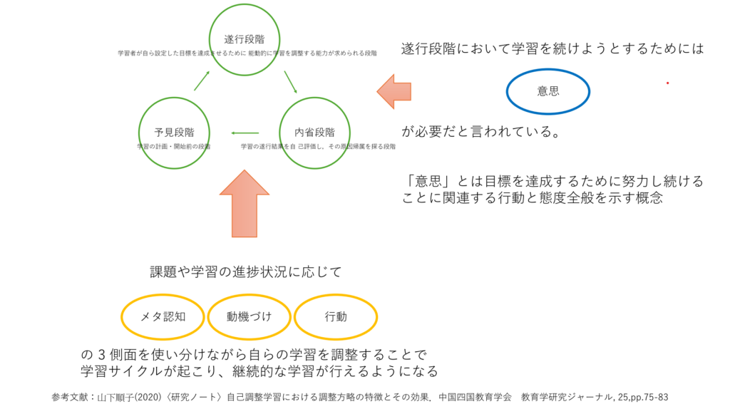 遂行段階=学習者が自ら設定した目標を能動的に達成させるために学習を調整する能力が求められる段階を指します。
