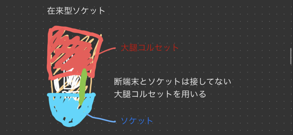 在来型ソケットは、ソケットの上縁は脛骨の関節面以下で、ソケットライナーは用いず、ソケット底は閉じていない。また、通常は大腿コルセットとともに用いられ、体重支持は、ソケット上縁付近と大腿コルセットで行います。