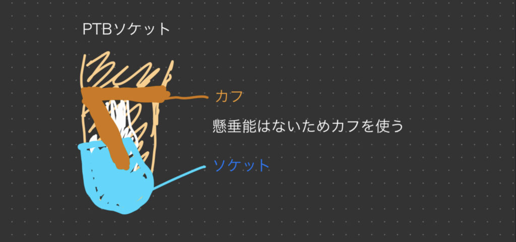 (覚え方)PTB式ソケットはP(パテラ(膝蓋骨))T(天丼=半熟=半分くらいしか出てない)B(ぶらぶらするのでカフを使う)で覚えてみましょう。