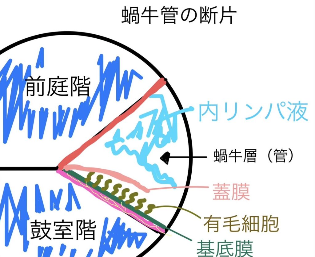 こんな感じです。先ほど図はイメージですので、このように蝸牛管(層)は実際には前庭膜、基底膜に接している蝸牛管は接しています