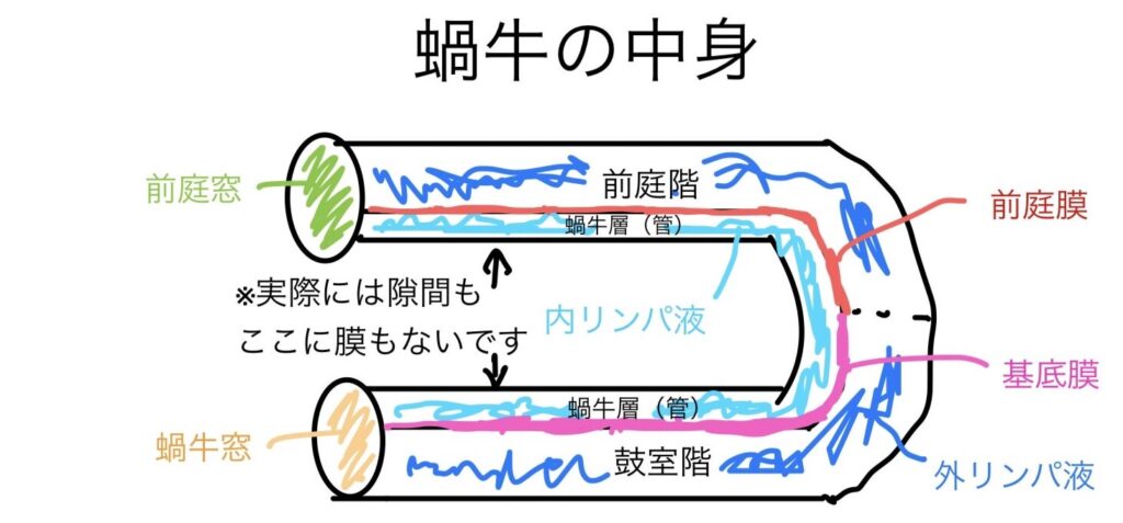 図はイメージですので、実際には前庭膜、基底膜に接している蝸牛管は接しています