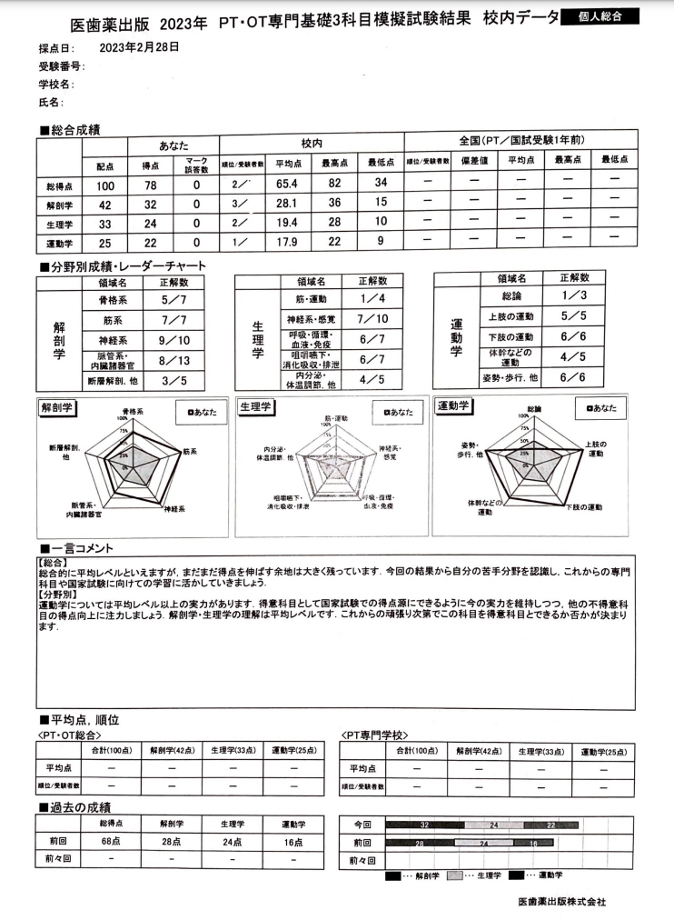 点数は1年生の時に比べアップはしているけど、不安要素は上記の通りで、実際に臨床現場では必要になってくる事や推論の際に活用することができる幅が広がるのでこの3科目は大切だなとは思っています…